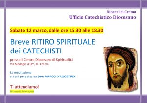 Vi aspettiamo sabato 12 marzo dalle ore 15:30 alle ore 1830 presso il Centro di Spiritualità in via Medaglie d’Oro 8 a Crema per il ritiro quaresimale diocesano per i catechisti.