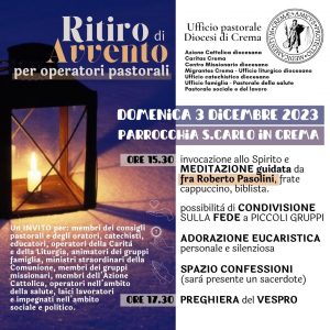 Vi aspettiamo domenica 3 dicembre dalle ore 15:30 presso la Chiesa parrocchiale San Carlo in Crema per il ritiro del tempo di Avvento pensato anche per tutti i catechisti della diocesi.