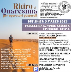 Vi aspettiamo domenica 9 marzo dalle ore 15:30 presso la Chiesa parrocchiale di Santa Maria Assunta a Ombriano – Crema per il ritiro del tempo di Quaresima pensato anche per tutti i catechisti della diocesi.